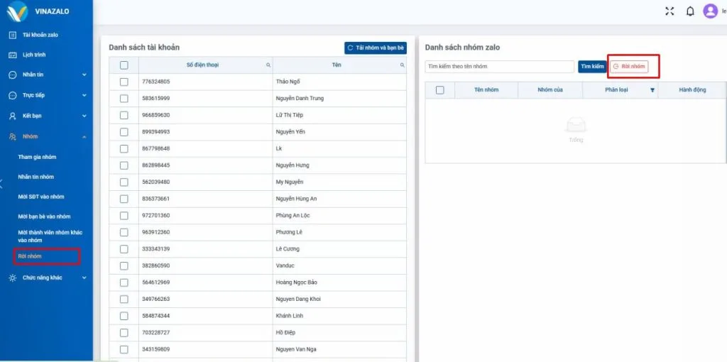 Để đáp ứng nhu cầu rời nhóm Zalo nhanh và tiện lợi, phần mềm Vina Zalo đã tích hợp tính năng thoát nhóm Zalo tự động thông minh. Công cụ này cho phép người dùng quét toàn bộ danh sách nhóm mà tài khoản đang tham gia, sau đó lựa chọn những nhóm không cần thiết và thực hiện thoát nhóm hàng loạt chỉ với vài thao tác đơn giản.