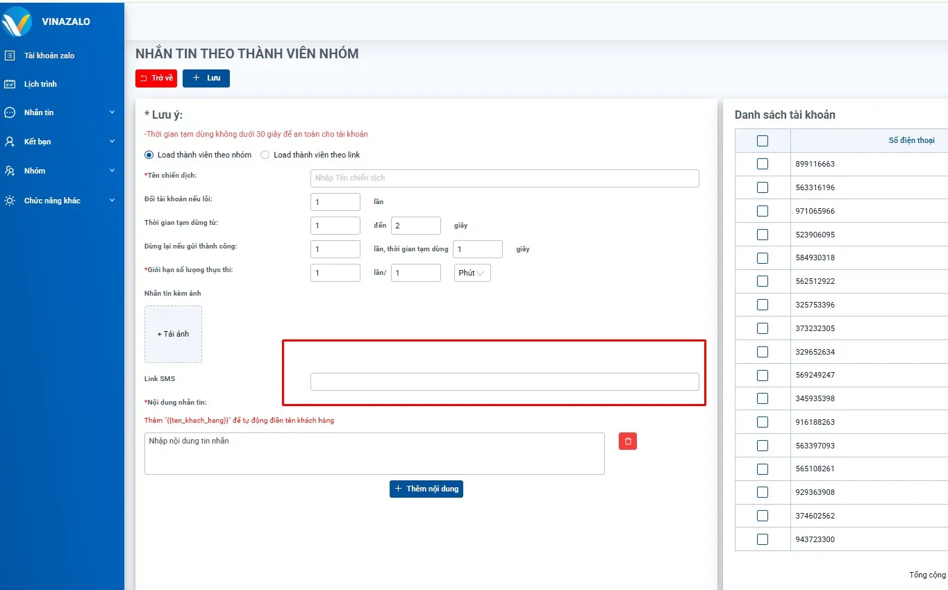 Bước 4: Trong phần cấu hình, nhập nội dung tin nhắn và chèn link nhóm Zalo vào mục “Link SMS”.