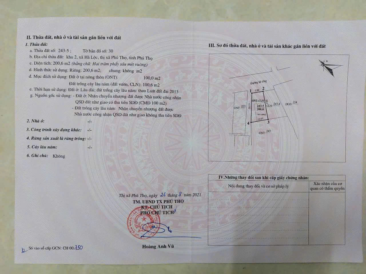 - Diện tích: 200,6m² (trong đó 100m² thổ cư)
