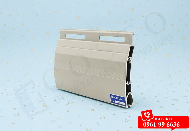 - Trên thân Cửa cuốn nan nhôm B100 mặt trước đều được dán tem nhôm màu xanh có tên Austdoor.