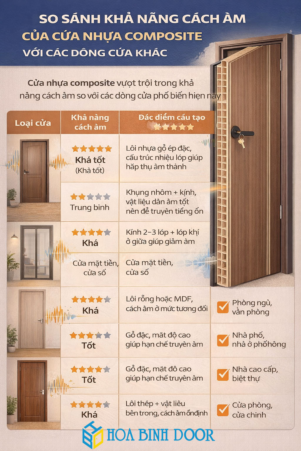 Bảng so sánh khả năng cách âm của cửa nhựa composite với các loại cửa khác
