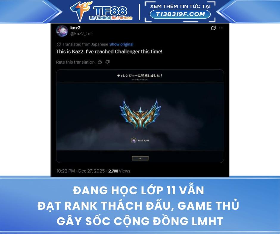 🧠 Nhân vật chính là chủ tài khoản kaz2 #JP1, người đã đăng tải hình ảnh thăng hạng Thách Đấu vào ngày 27/12. Dù tuổi đời còn rất trẻ, kaz2 đã gây ấn tượng mạnh với khả năng chơi Đi rừng, sử dụng thành thạo nhiều vị tướng kỹ năng cao và thể hiện tư duy macro vượt xa độ tuổi.