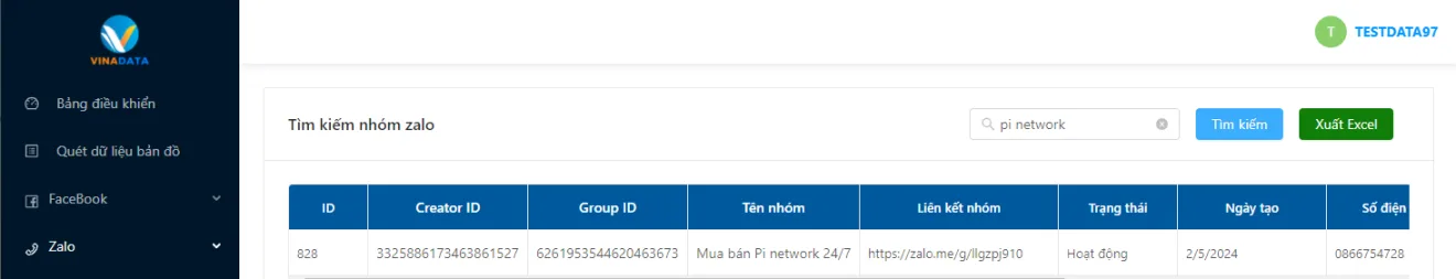 Nếu bạn muốn tìm và khai thác hàng trăm nhóm Zalo Pi Network chỉ với vài thao tác, hãy sử dụng phần mềm Vina Data – công cụ được nhiều người dùng đánh giá cao về tốc độ và độ chính xác.
