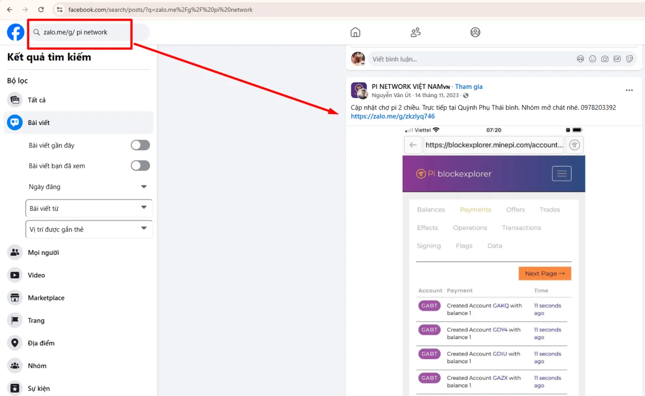 Ví dụ: gõ trên Google hoặc Facebook dòng “zalo.me/ cộng đồng Pi”, bạn sẽ nhận được danh sách các nhóm liên kết trực tiếp – gồm link nhóm và thông tin liên hệ thành viên thực tế.