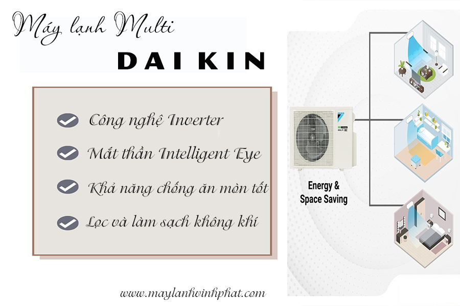 - Daikin là thương hiệu lớn chuyên về các sản phẩm điện máy, đặc biệt phải kể đến hệ thống Máy lạnh MULTI DAIKIN. Dòng Máy lạnh MULTI DAIKIN được phần đông người tiêu dùng đánh giá cao về độ tiện lợi, rất phù hợp với những chung cư, nhà riêng có từ 3-5 phòng, ban công hẹp, không đủ để chứa 3 đến 5 dàn nóng cùng lúc.
