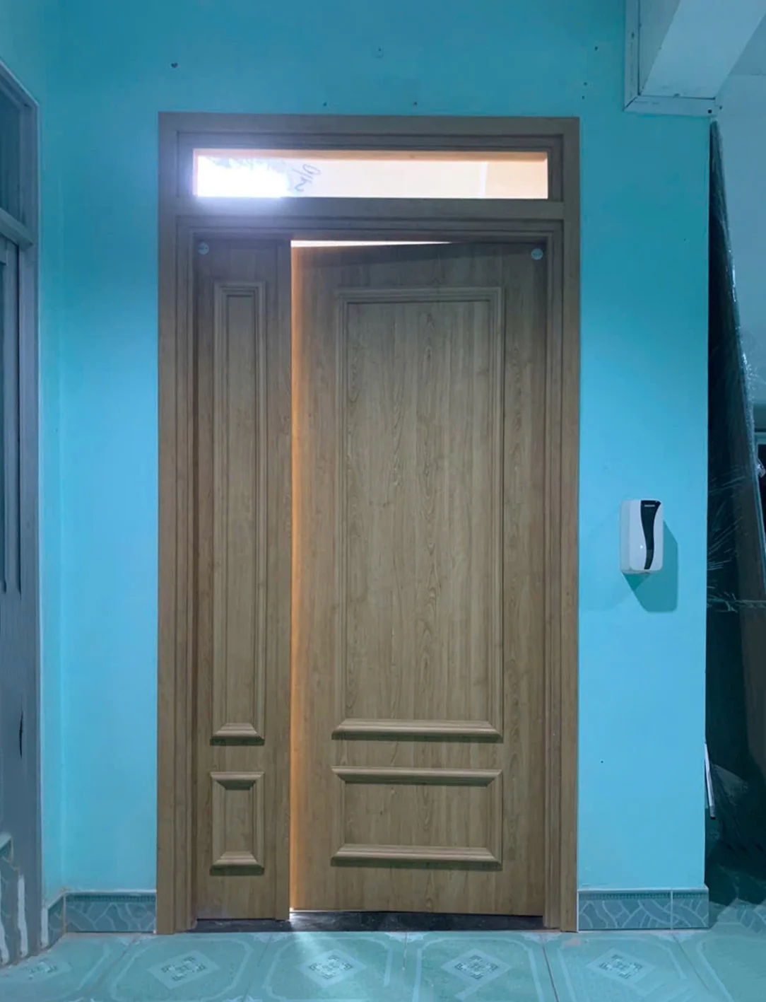 - Cánh cửa được sản xuất từ hạt nhựa PVC và hạt gỗ xay mịn đùn ép thành khuân mẫu hoàn thiện dưới nhiệt độ và áp suất lớn.