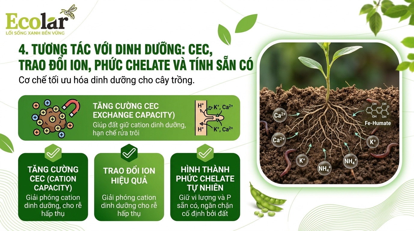 Chỉ số CEC (khả năng trao đổi cation) có thể hiểu như dung tích chiếc dạ dày của đất. Khi bổ sung hợp chất mùn vào những vùng đất cát cằn cỗi, nó đóng vai trò như một "miếng bọt biển" khổng lồ mang vô số điện tích âm, lập tức kéo chỉ số CEC tăng vọt. Thay vì để các dưỡng chất quý giá như Đạm (NH4+), Kali (K+), Canxi (Ca2+) bị dòng nước tưới cuốn trôi xuống mạch nước ngầm, miếng bọt biển này sẽ giữ chúng lại ngay tại vùng rễ hoạt động. Điều này mang lại lợi ích kinh tế sát sườn: bà con nông dân tiết kiệm được lượng lớn phân bón mà cây vẫn xanh tốt rạng rỡ.