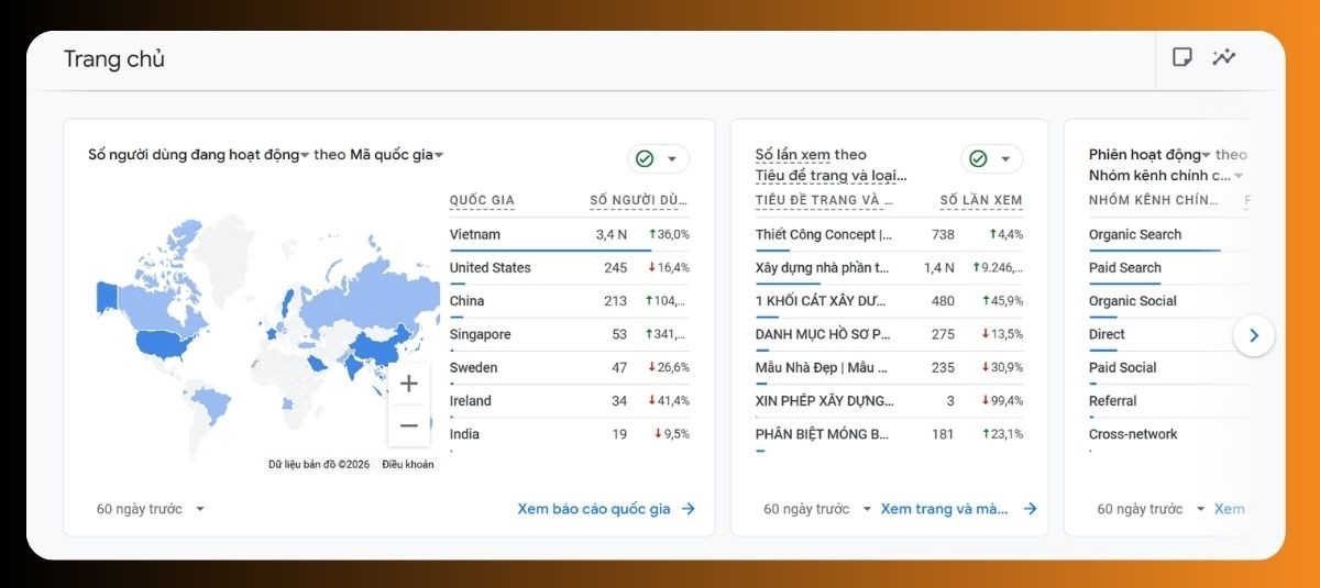 - Theo dõi lưu lượng từ các kênh khác nhau: SEO, Google Ads, Facebook, Email, Referral,...