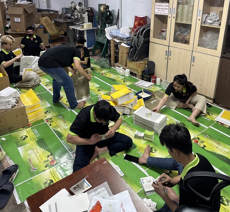 Sau khi hoàn tất khâu in, các kỹ thuật gia công sau in như cán màng (bóng hoặc mờ), ép kim, dập chìm/nổi, phủ UV định hình... sẽ được thực hiện để tạo điểm nhấn và tăng tính thẩm mỹ cho bao bì. Mỗi công đoạn đều được thực hiện cẩn thận để đảm bảo thành phẩm cuối cùng đạt chất lượng tốt nhất.