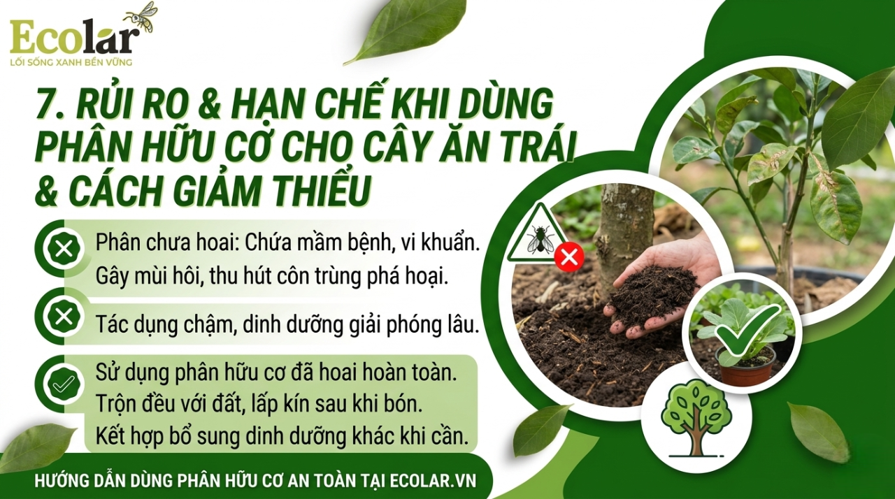 Cần đảm bảo phân đã được ủ hoai hoàn toàn trước khi sử dụng. Bón quanh tán cây thay vì sát gốc và điều chỉnh liều lượng phù hợp với từng giai đoạn.