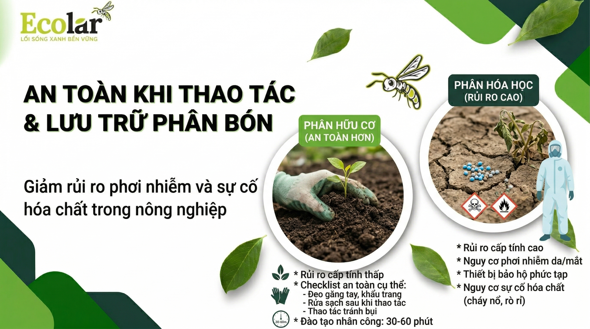 Phân hóa học thường có nguy cơ gây kích ứng, ăn mòn hoặc độc tính cao nếu sử dụng sai cách. Trong khi đó, phân hữu cơ ít gây nguy hiểm hơn, đặc biệt trong các tình huống tiếp xúc thường xuyên.