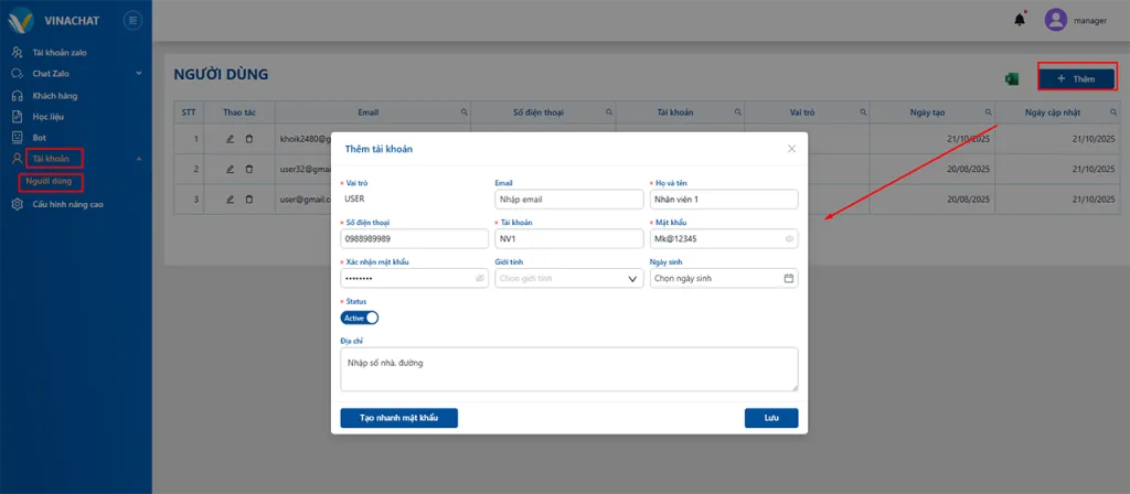 Tạo người dùng để phân quyền quản lý chat các tài khoản Zalo