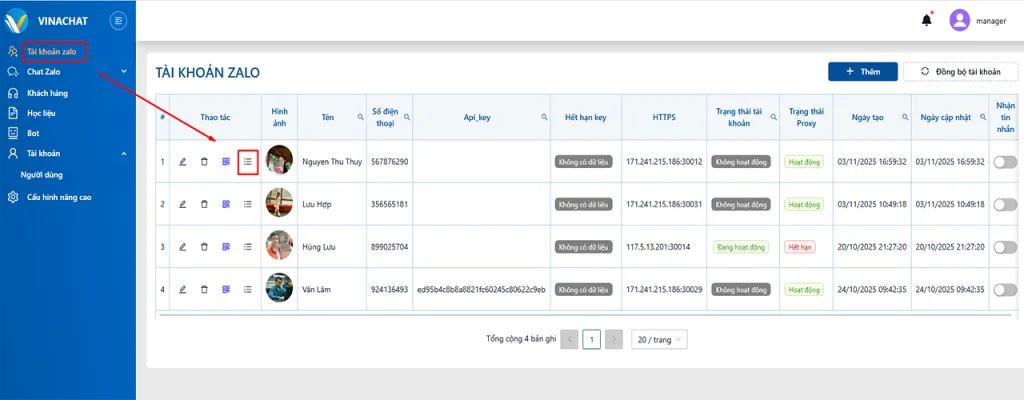 Phần quyền truy cập và quản lý chat các nick Zalo cho người dùng