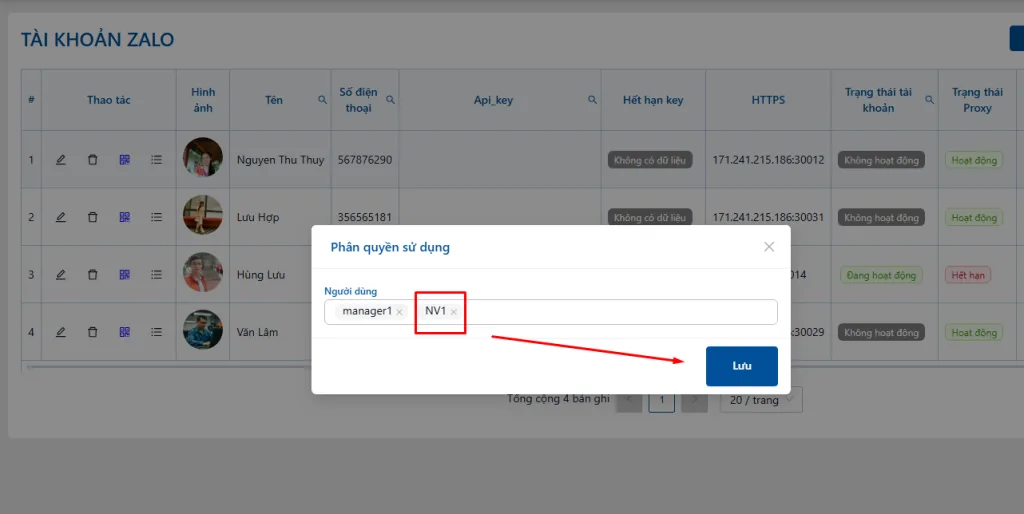 Tiếp theo các bạn muốn phân quyền nick Zalo đó cho người dùng nào thì chọn người dùng đó theo tên người dùng đã tạo trước đó và bấm lưu là xong.