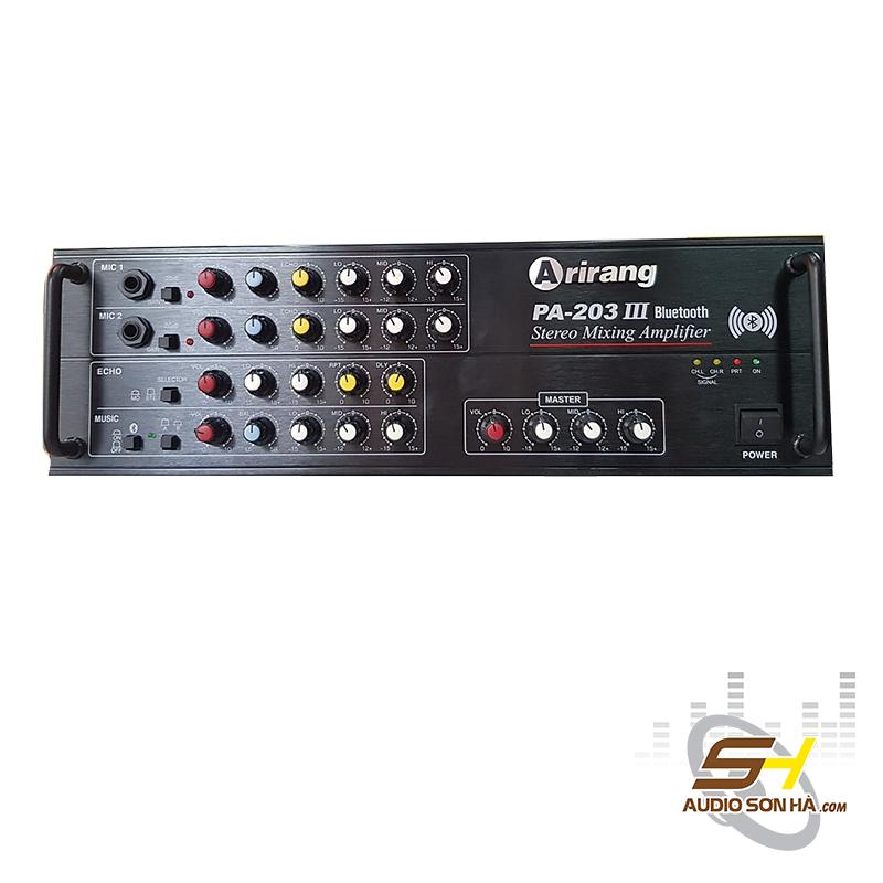 Arirang SPA 203IIIB công suất 200W, input mic/line. Tính năng: EQ bass/treble, 5.1 support. Lợi ích: Âm thanh ấm, dễ dùng, bass chắc cho home karaoke. Giá liên hệ, thiết kế thân thiện.