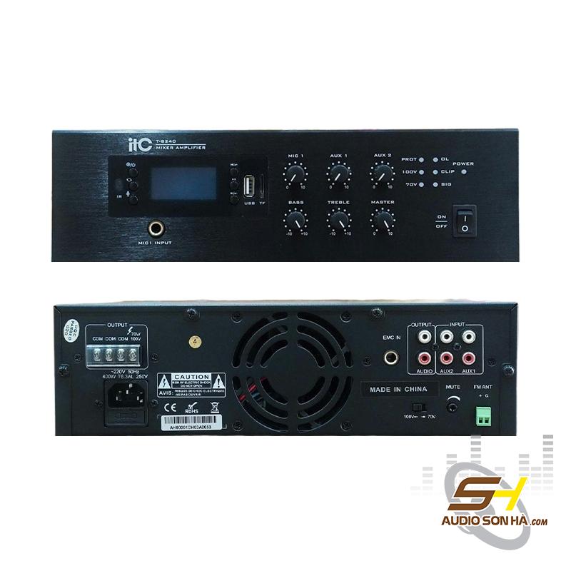 ITC T-B240 240W, hỗ trợ MP3/Tuner/Bluetooth. Tính năng: LCD MP3 module, ưu tiên MIC1, bảo vệ quá tải. Lợi ích: Bass sâu, linh hoạt cho quán/cafe, di động cao. SNR ≥75dB, 4.1kg. Giá liên hệ.