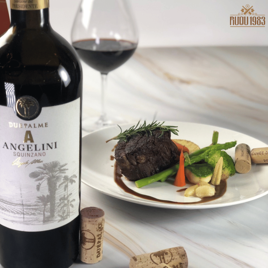 Chai vang mạnh mẽ: Due Palme Angelini A mang đến một hương vị mạnh mẽ nhưng lại rất dễ uống. Được làm từ giống nho đặc trưng của Puglia, Ý, chai vang này mang đậm hương thơm của quả mọng đỏ và gia vị nhẹ nhàng.